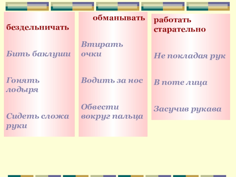 Бездельничать, обманывать, работать старательно.