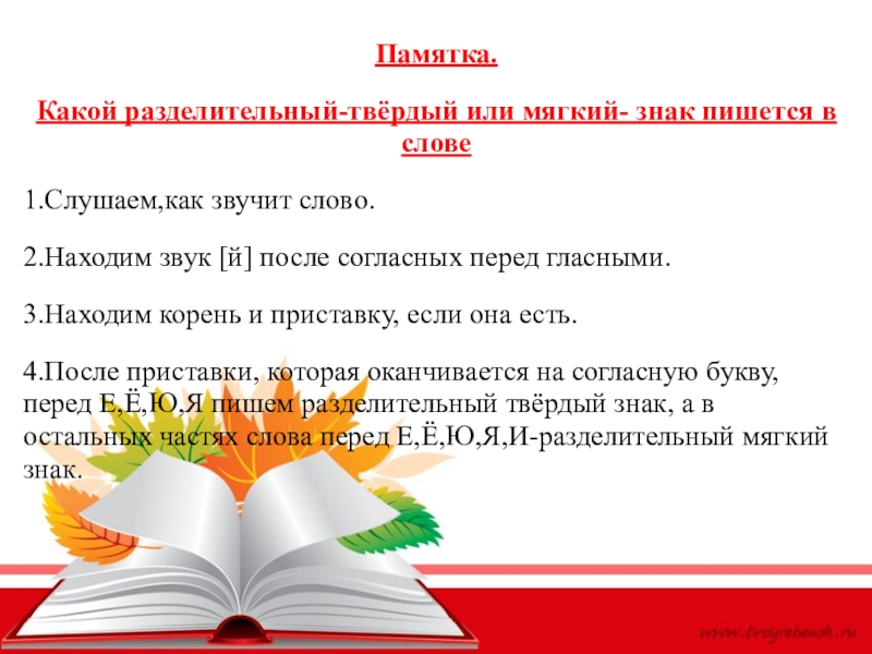 4.После приставки, которая оканчивается на согласную букву, перед Е,Ё,Ю,Я пишем разделительный твёрдый знак, а в остальных частях слова перед Е,Ё,Ю,Я,И-разделительный мягкий знак.