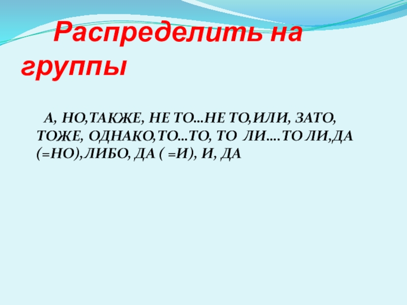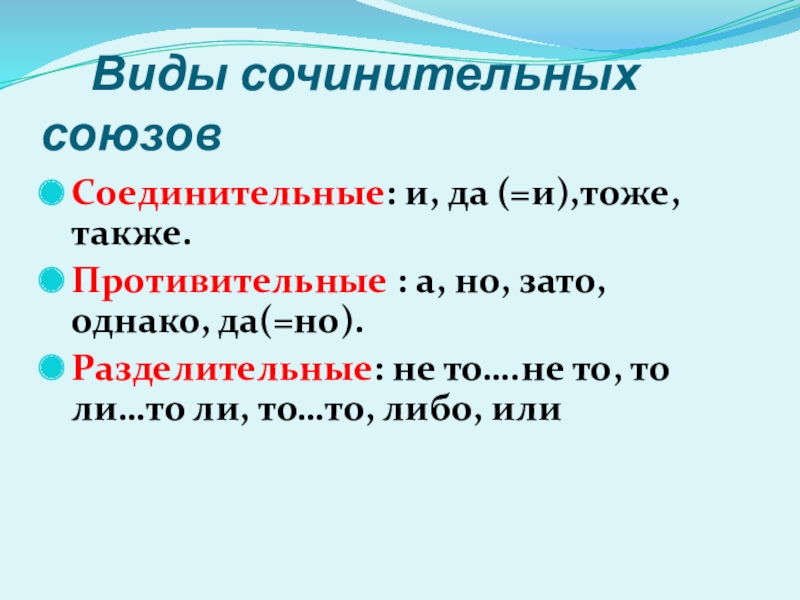 А, НО,ТАКЖЕ, НЕ ТО…НЕ ТО,ИЛИ, ЗАТО, ТОЖЕ, ОДНАКО,ТО…ТО, ТО ЛИ….ТО ЛИ,ДА (=НО),ЛИБО, ДА ( =И), И, ДА