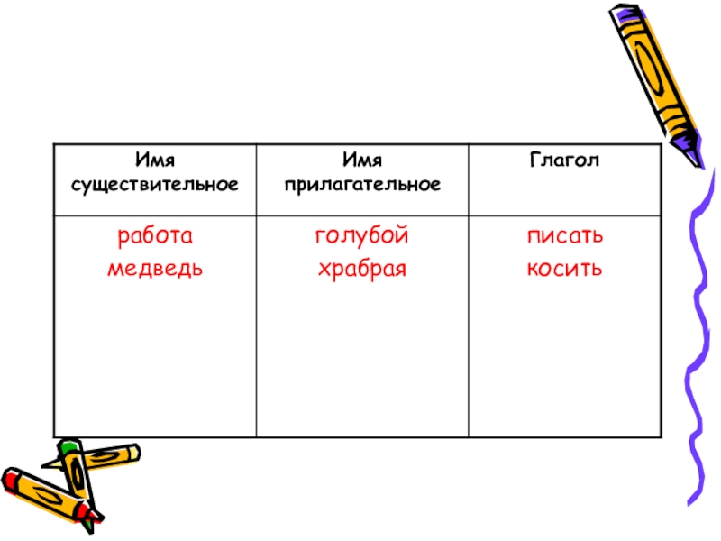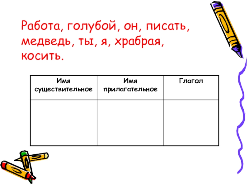 Слайд 2Работа, голубой, он, писать, медведь, ты, я, храбрая, косить.