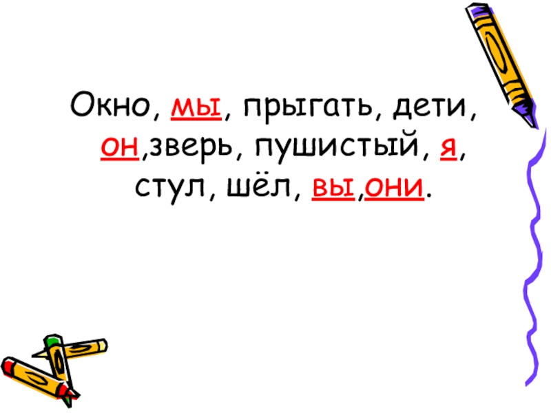 Окно, мы, прыгать, дети,он,зверь, пушистый, я, стул, шёл, вы,они.