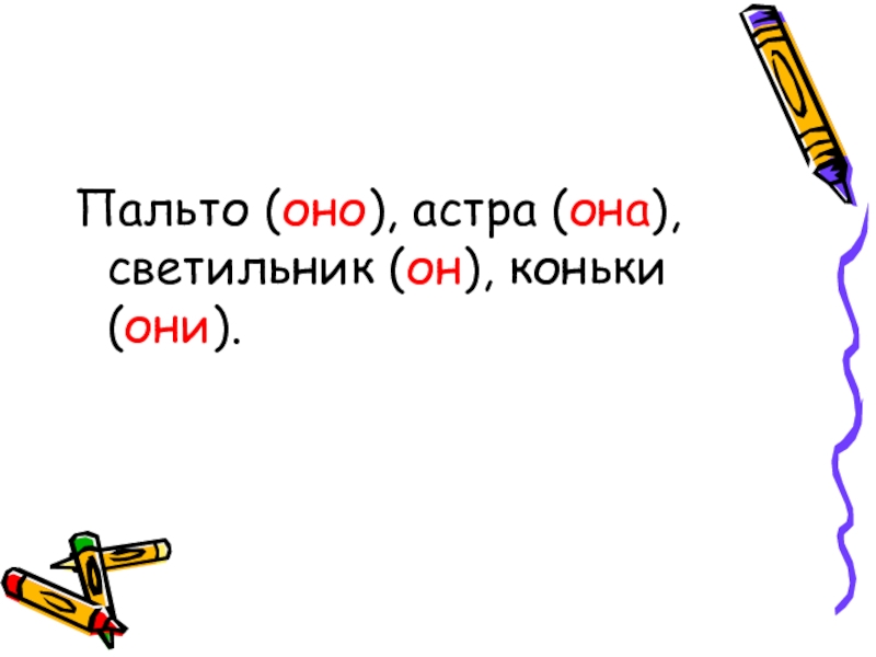 Пальто (оно), астра (она), светильник (он), коньки (они).