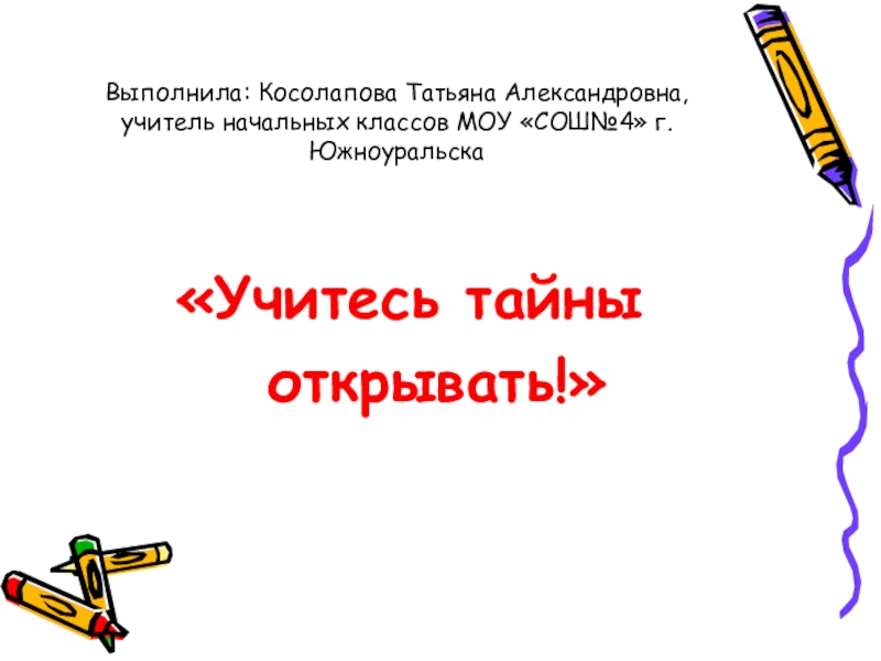 Выполнила: Косолапова Татьяна Александровна, учитель начальных классов МОУ «СОШ№4» г.Южноуральска    «Учитесь тайныоткрывать!»