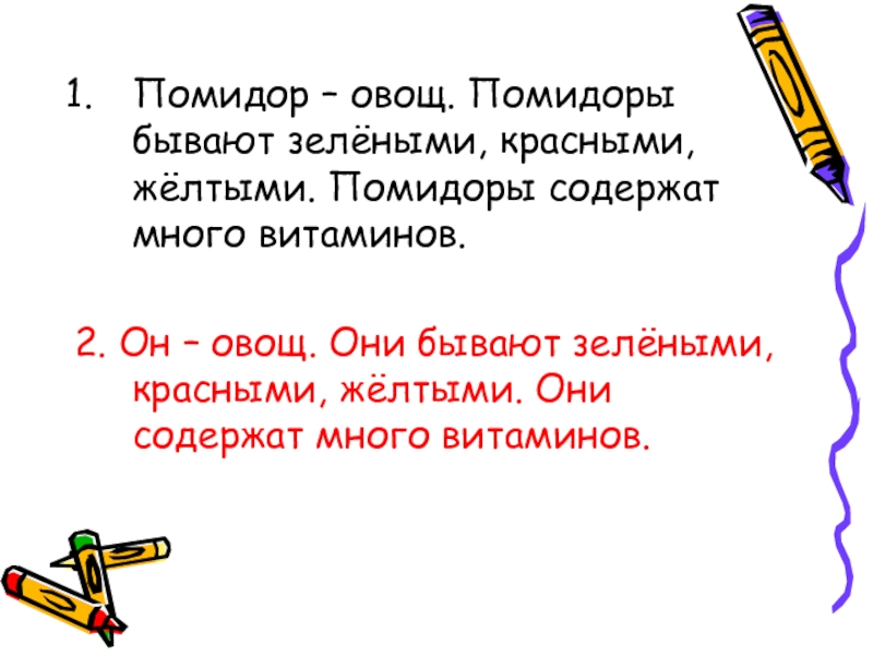 Помидор – овощ. Помидоры бывают зелёными, красными, жёлтыми. Помидоры содержат много витаминов.2. Он – овощ. Они бывают