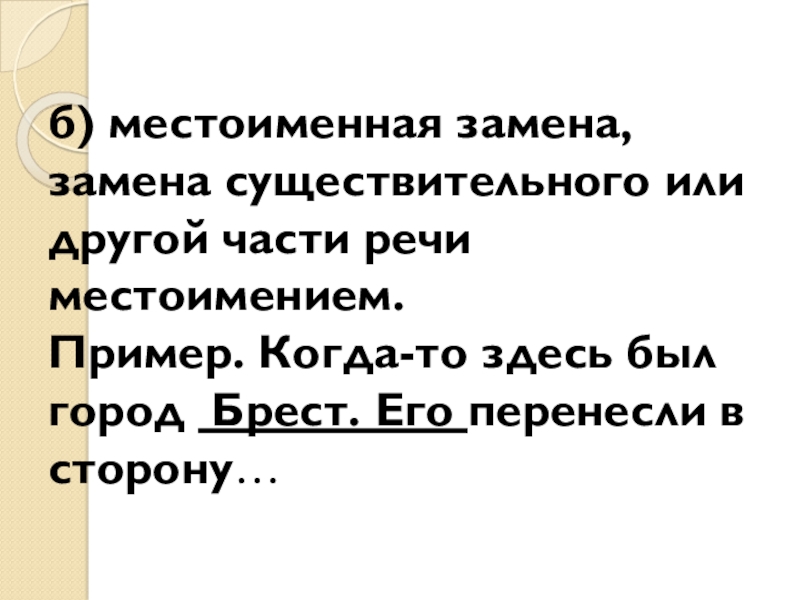 Слайд 29б) местоименная замена, замена существительного или другой части речи местоимением.