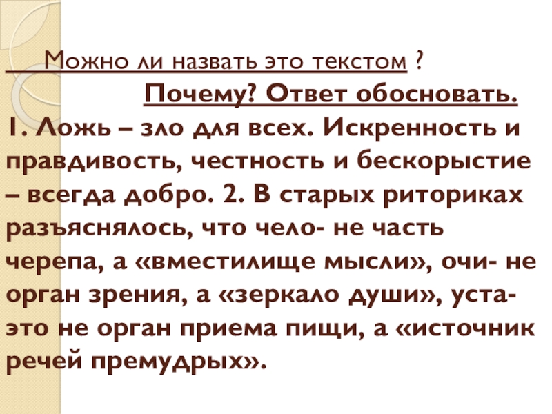 1. Ложь – зло для всех. Искренность и правдивость, честность и бескорыстие – всегда добро. 2. В старых риториках разъяснялось, что чело- не часть черепа, а «вместилище мысли», очи- не орган зрения, а «зеркало души», уста-это не орган приема пищи, а «источник речей премудрых».