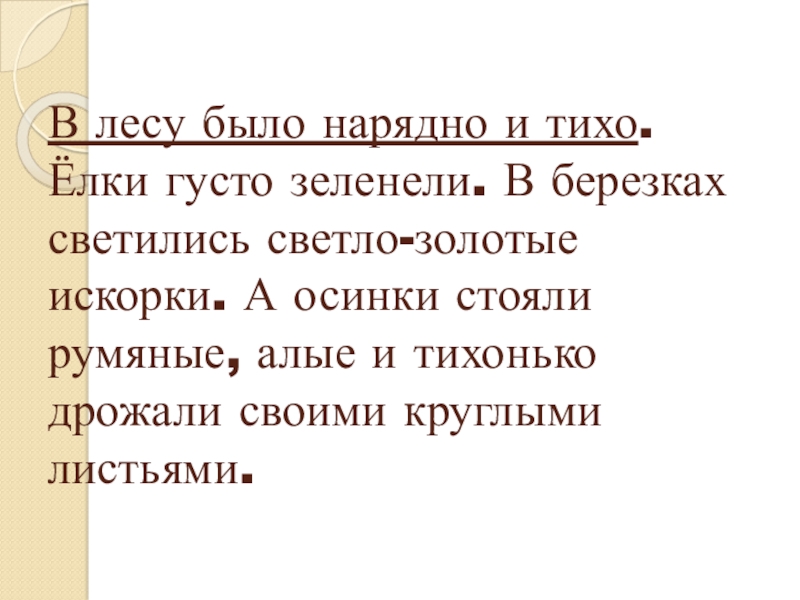Слайд 19В лесу было нарядно и тихо. Ёлки густо зеленели. В березках