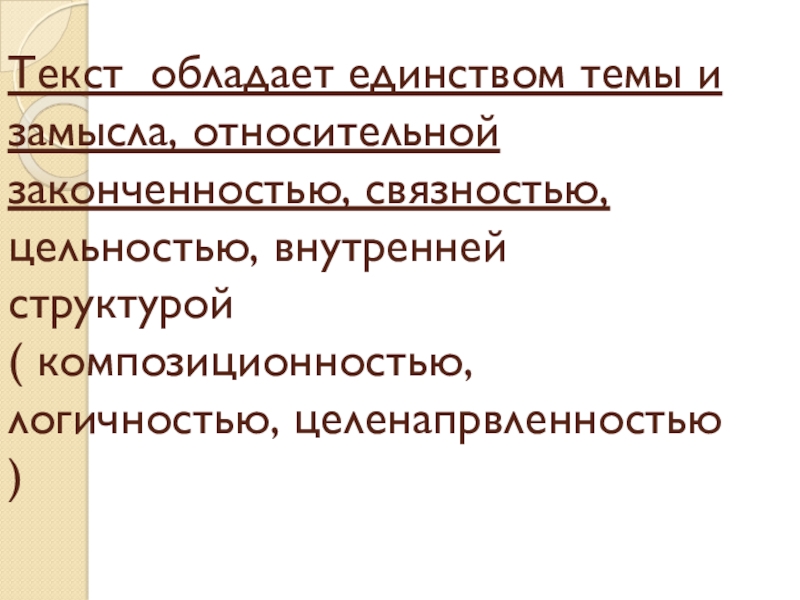 Слайд 5Текст обладает единством темы и замысла, относительной законченностью, связностью, цельностью, внутренней