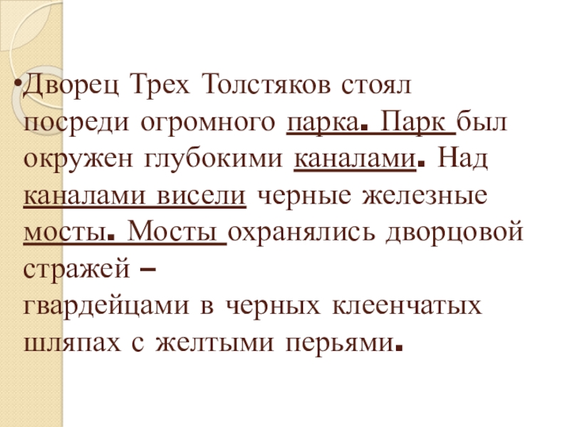 Слайд 11Дворец Трех Толстяков стоял посреди огромного парка. Парк был окружен глубокими