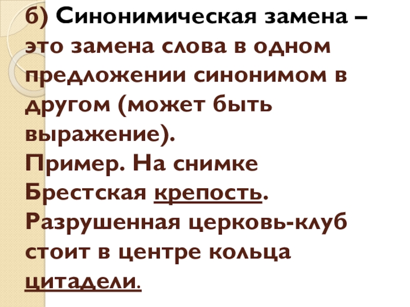 Слайд 27б) Синонимическая замена – это замена слова в одном предложении синонимом