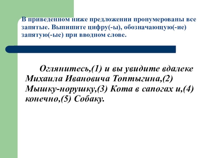 Оглянитесь,(1) и вы увидите вдалеке Михаила Ивановича Топтыгина,(2) Мышку-норушку,(3) Кота в сапогах и,(4)конечно,(5) Собаку.
