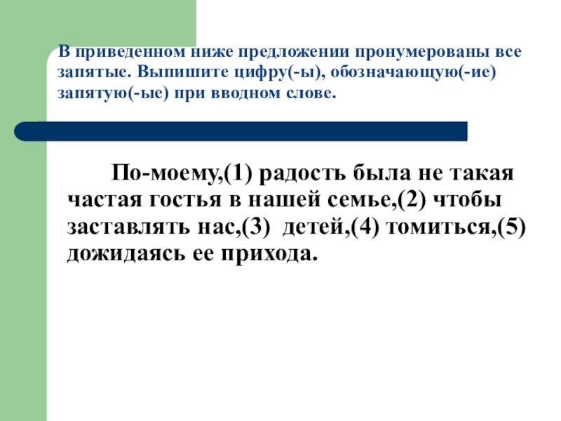 По-моему,(1) радость была не такая частая гостья в нашей семье,(2) чтобы заставлять нас,(3) детей,(4) томиться,(5) дожидаясь ее прихода.