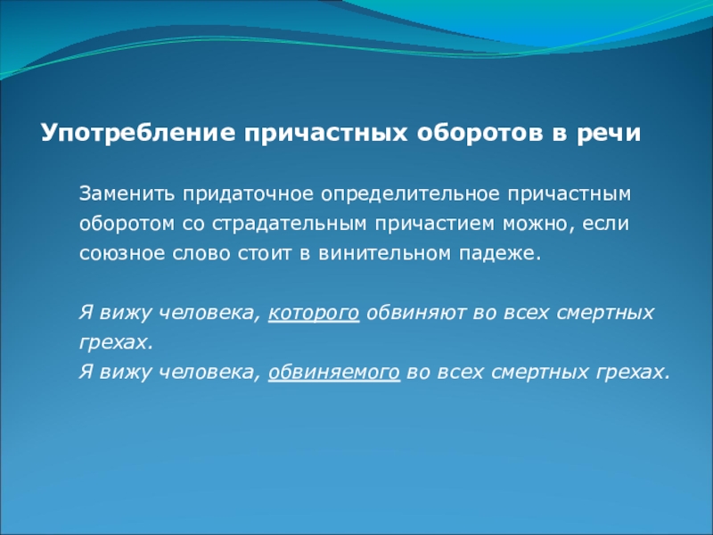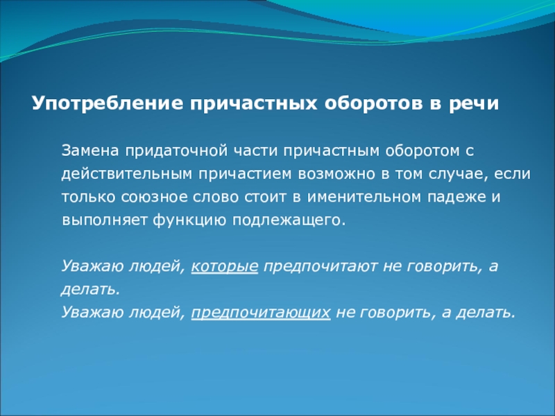 Слайд 18Употребление причастных оборотов в речи