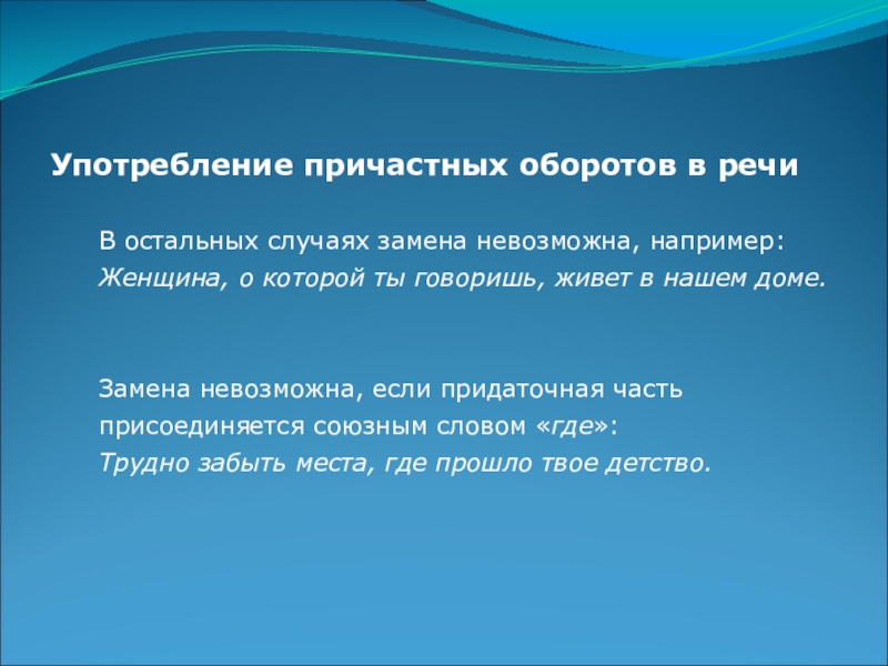 Слайд 19Употребление причастных оборотов в речи
