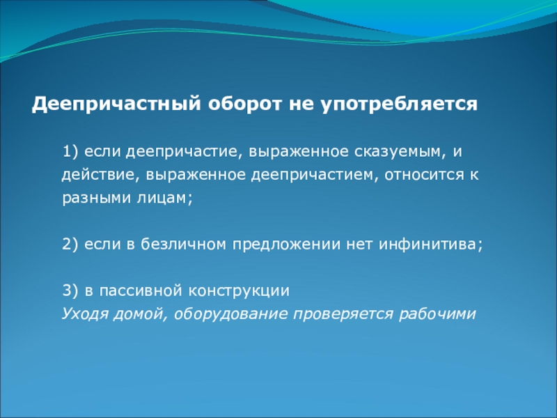 Слайд 16Деепричастный оборот не употребляется