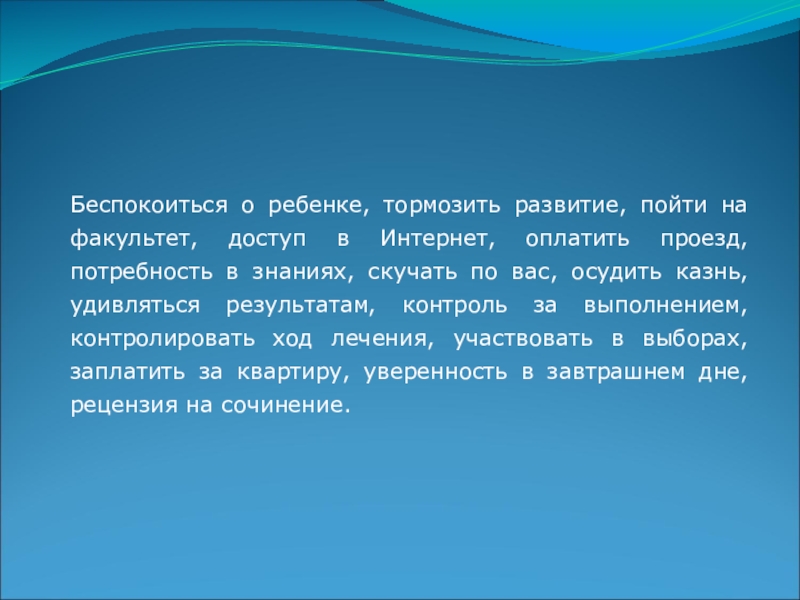 Слайд 14Беспокоиться о ребенке, тормозить развитие, пойти на факультет, доступ в Интернет,