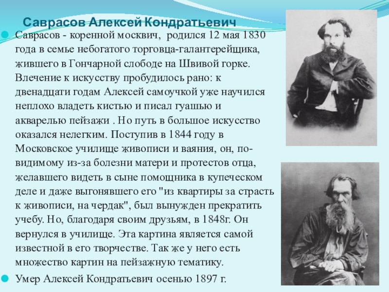 Саврасов Алексей КондратьевичСаврасов - коренной москвич, родился 12 мая 1830 года в семье небогатого торговца-галантерейщика, жившего в