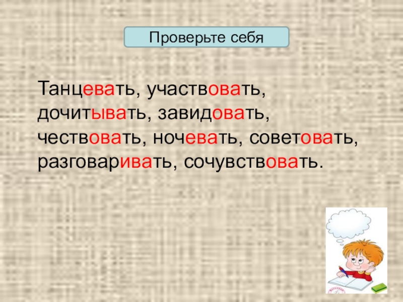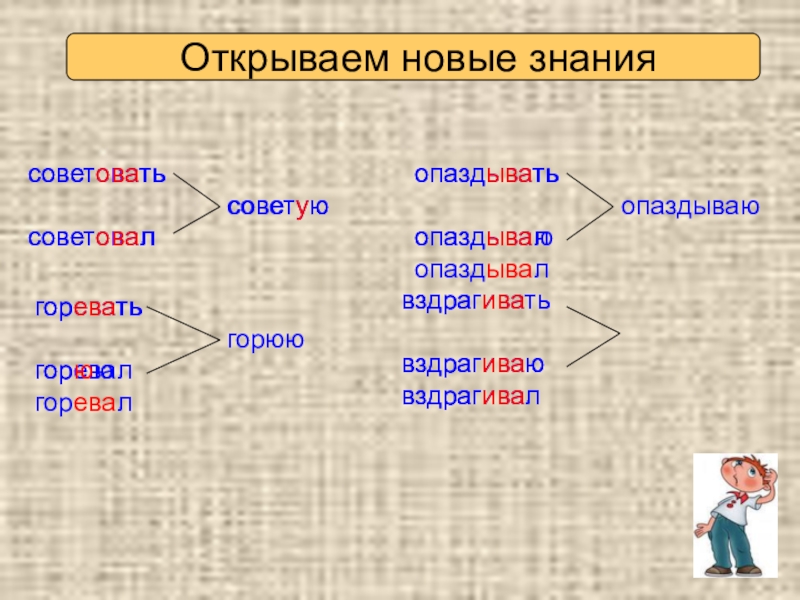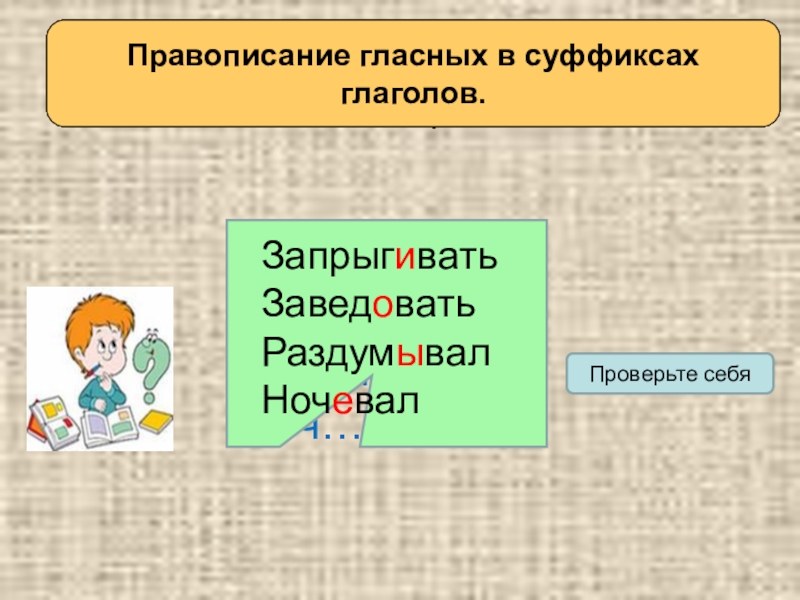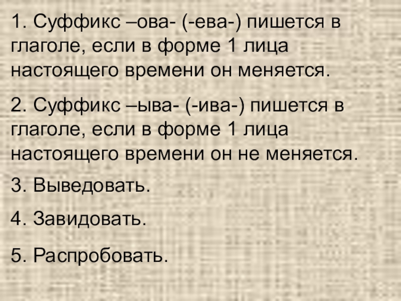 2. Суффикс –ыва- (-ива-) пишется в глаголе, если в форме 1 лица настоящего времени он не меняется.