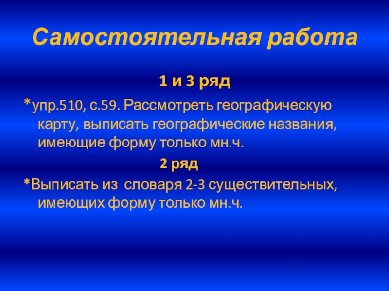 Самостоятельная работа1 и 3 ряд*упр.510, с.59. Рассмотреть географическую карту, выписать географические названия, имеющие форму только мн.ч.