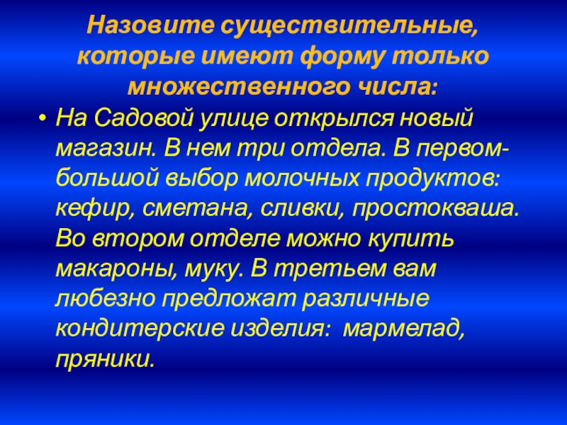 Назовите существительные, которые имеют форму только множественного числа:На Садовой улице открылся новый магазин. В нем три отдела.