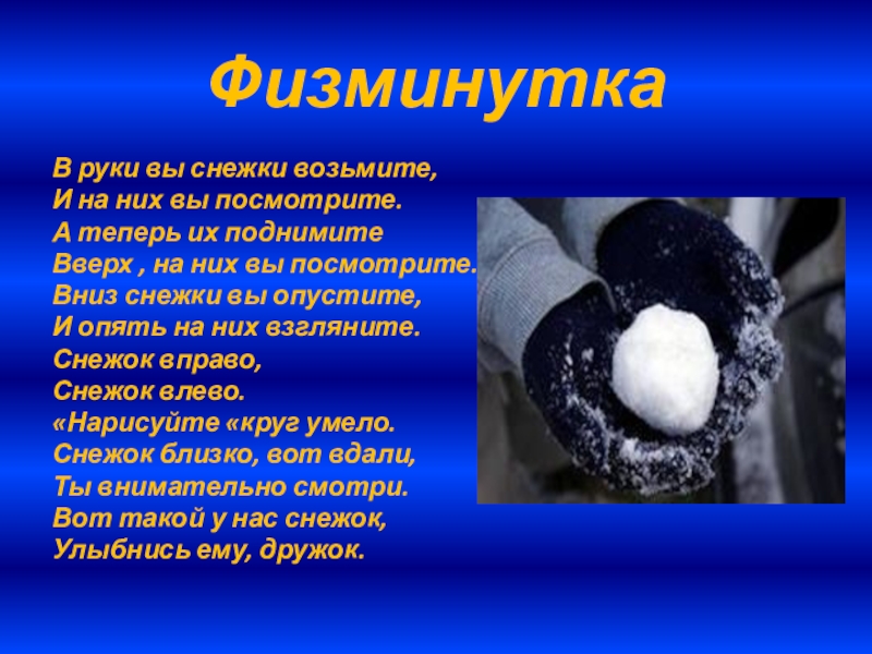 ФизминуткаВ руки вы снежки возьмите, И на них вы посмотрите.А теперь их поднимите Вверх , на них