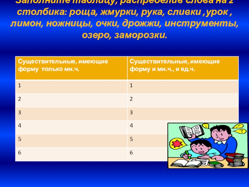Слайд 13Заполните таблицу, распределив слова на 2 столбика: роща, жмурки, рука, сливки