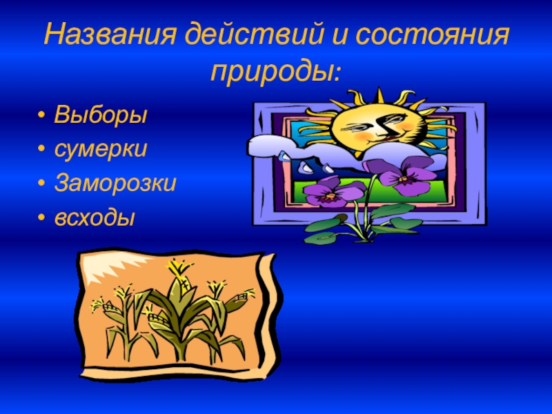 Названия действий и состояния природы:ВыборысумеркиЗаморозкивсходы