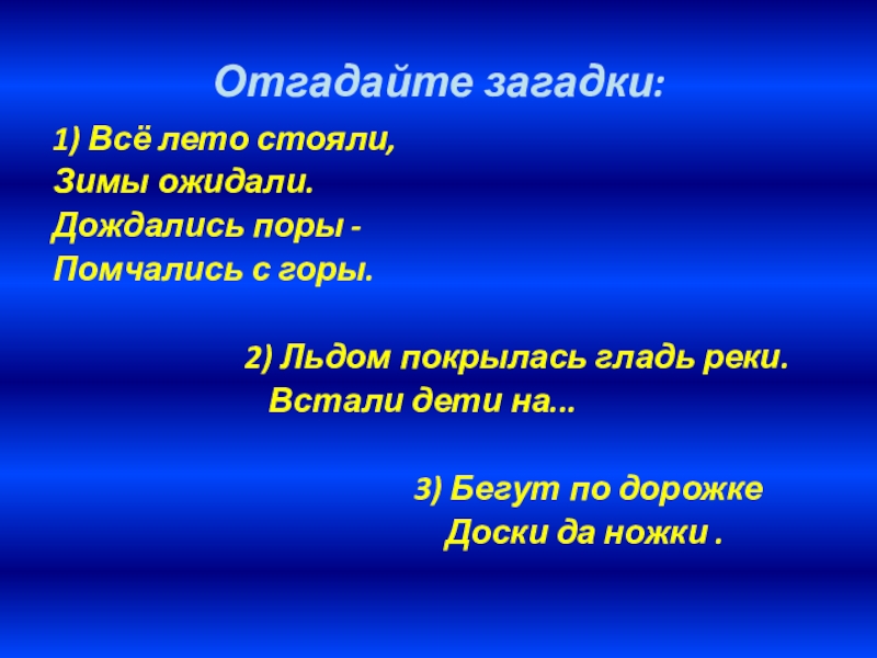 Отгадайте загадки:1) Всё лето стояли,Зимы ожидали.Дождались поры -Помчались с горы. 2) Льдом покрылась гладь реки.