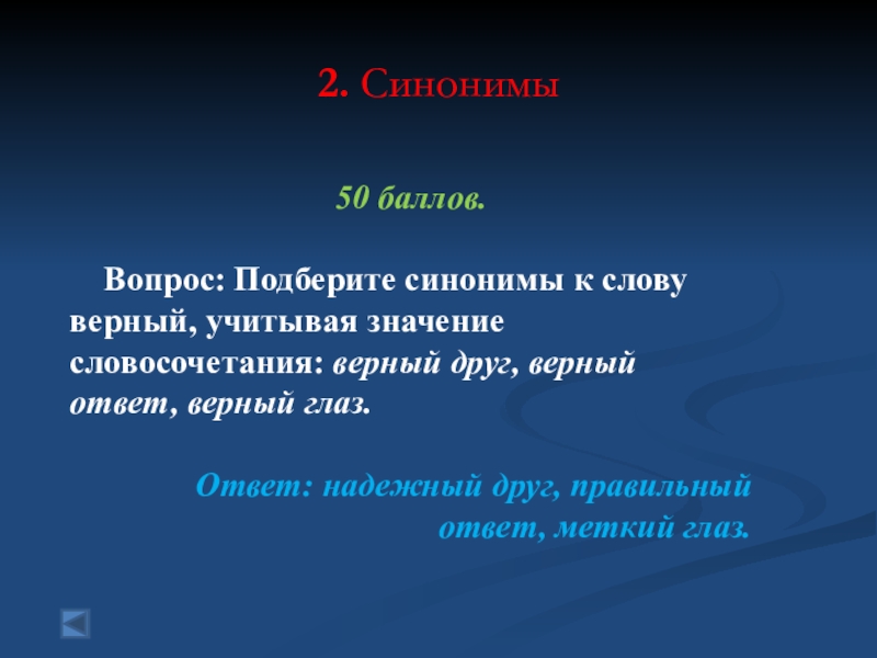 2. Синонимы50 баллов.  Вопрос: Подберите синонимы к слову верный, учитывая значение словосочетания: верный друг, верный ответ,