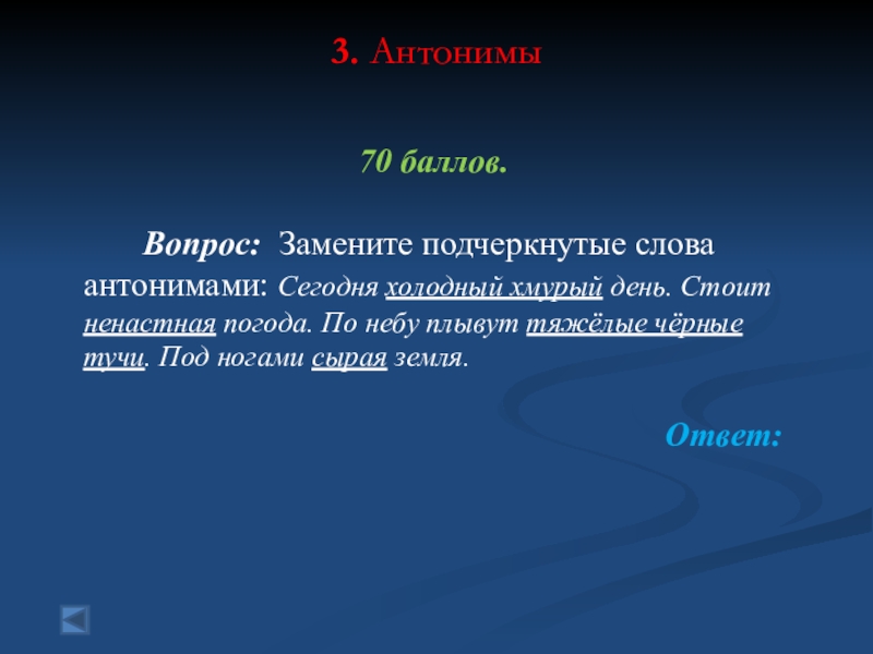 3. Антонимы  70 баллов.    Вопрос: Замените подчеркнутые слова антонимами: Сегодня холодный хмурый день.