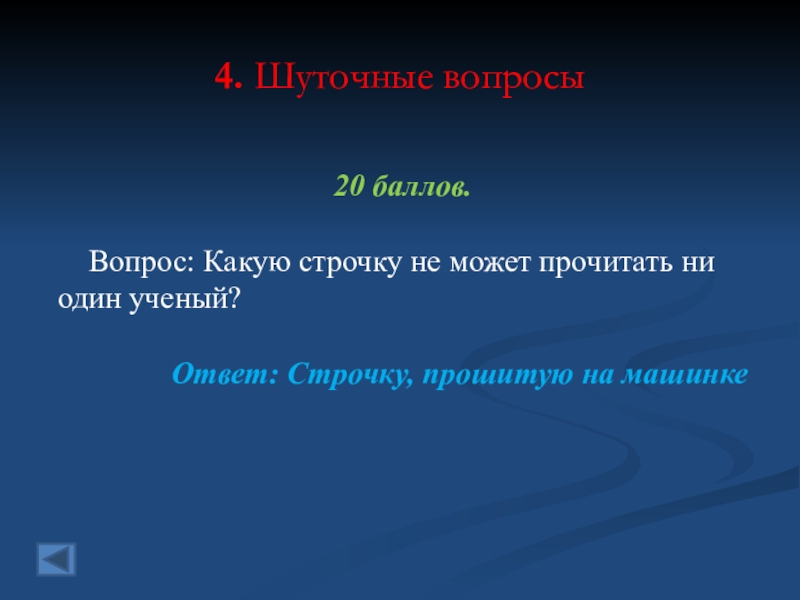 4. Шуточные вопросы20 баллов.   Вопрос: Какую строчку не может прочитать ни один ученый?Ответ: Строчку, прошитую