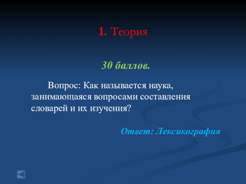 1. Теория30 баллов.    Вопрос: Как называется наука, занимающаяся вопросами составления словарей и их