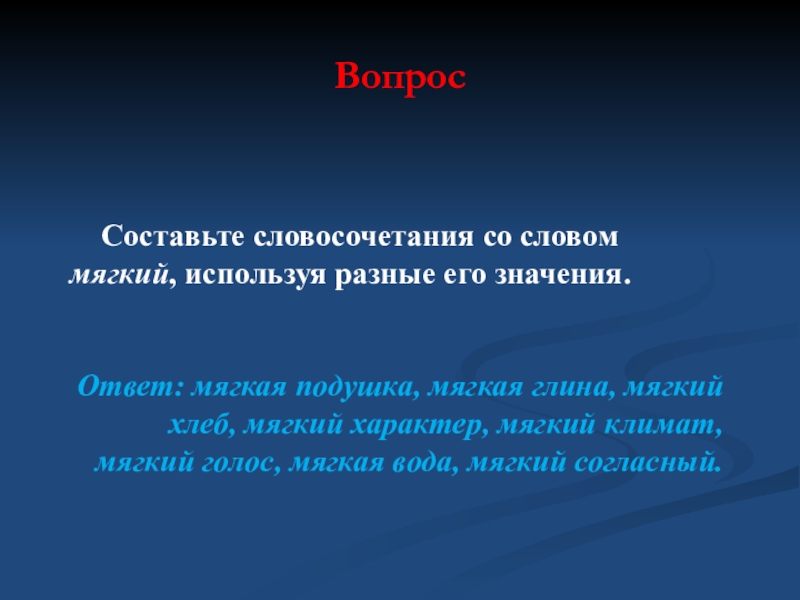 Вопрос   Составьте словосочетания со словом мягкий, используя разные его значения.Ответ: мягкая подушка, мягкая глина, мягкий