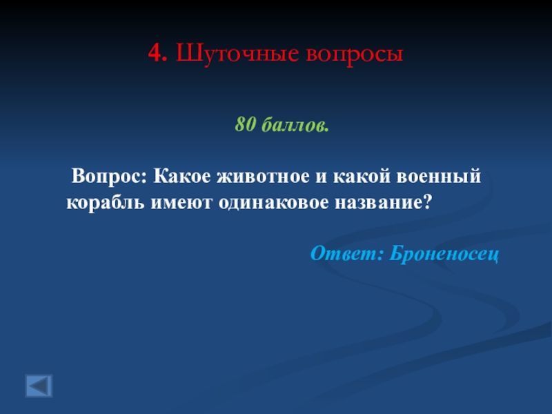 4. Шуточные вопросы 80 баллов. Вопрос: Какое животное и какой военный корабль имеют одинаковое название?Ответ: Броненосец
