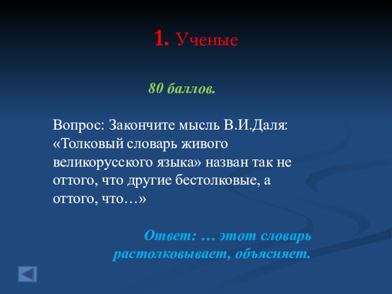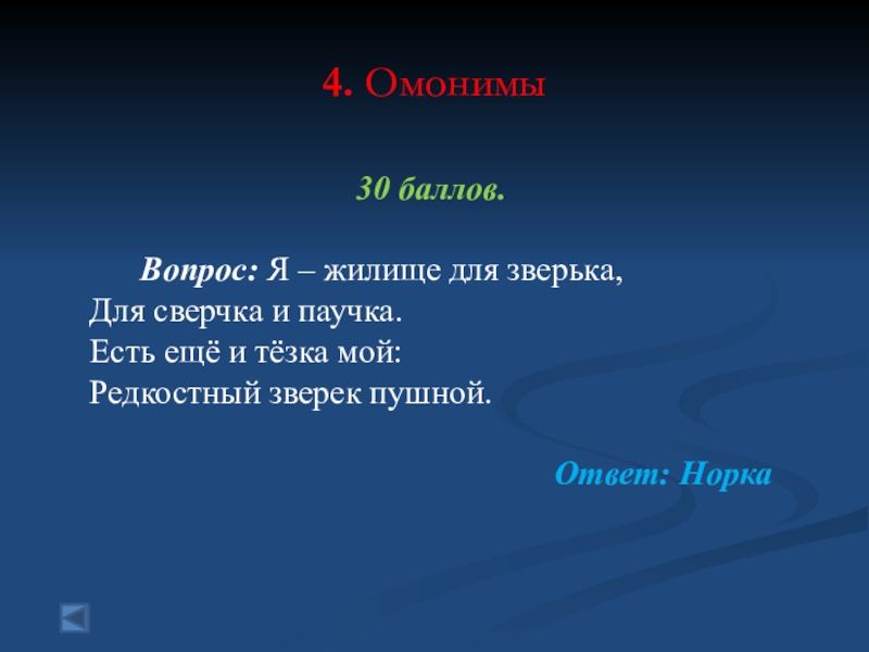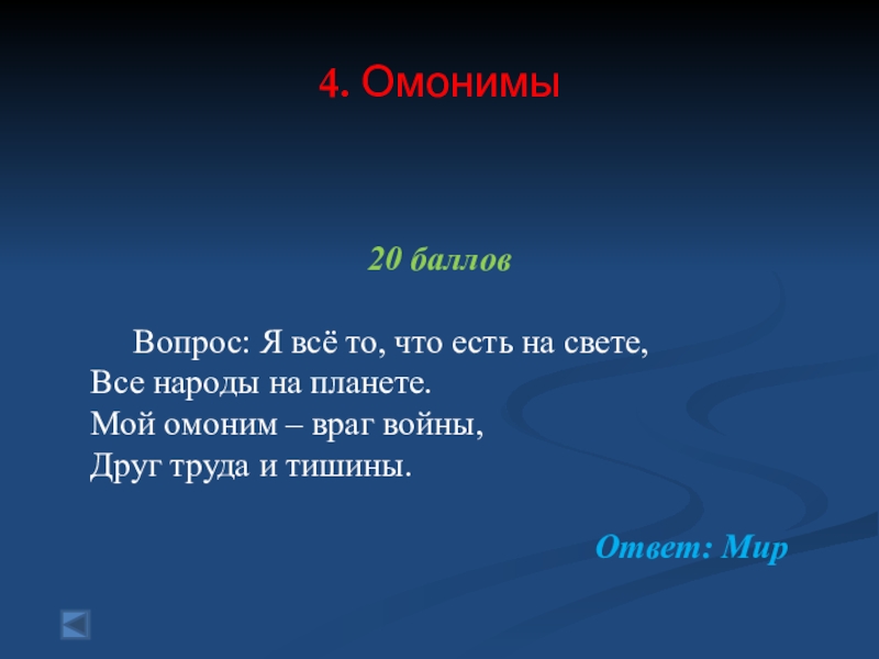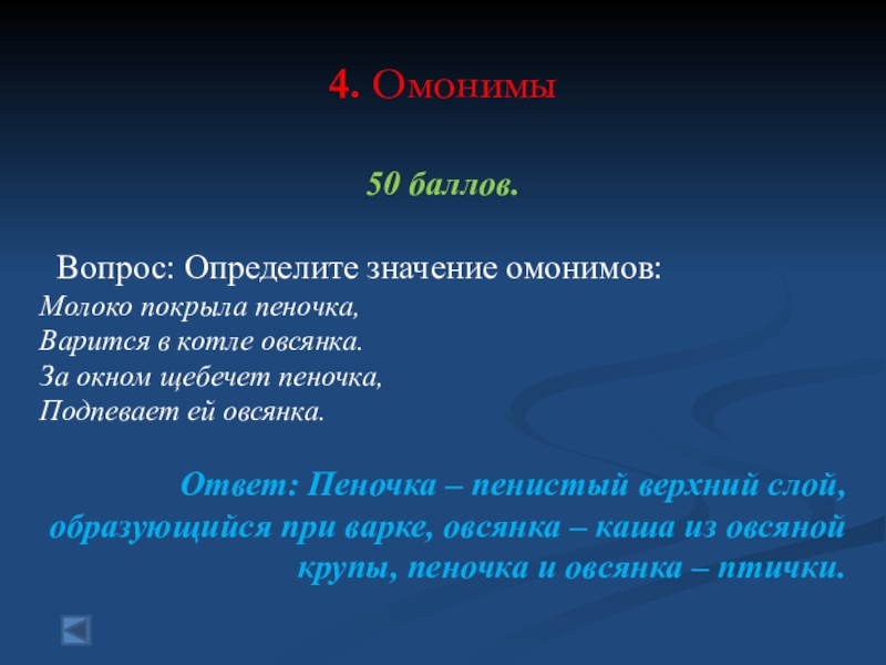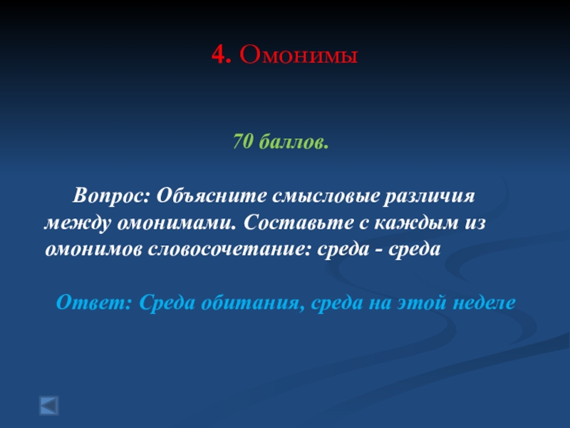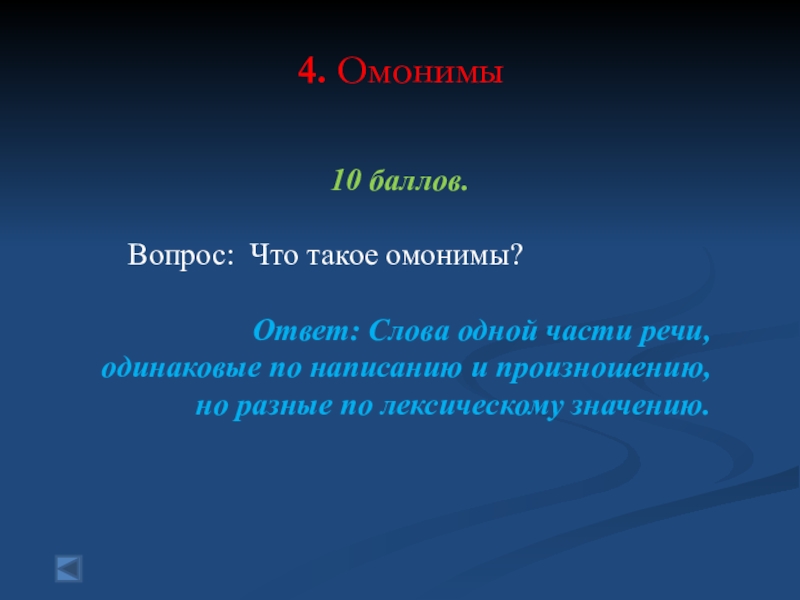 4. Омонимы 10 баллов.   Вопрос: Что такое омонимы?Ответ: Слова одной части речи, одинаковые по