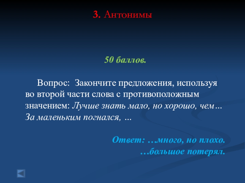 3. Антонимы 50 баллов.   Вопрос: Закончите предложения, используя во второй части слова с противоположным значением: