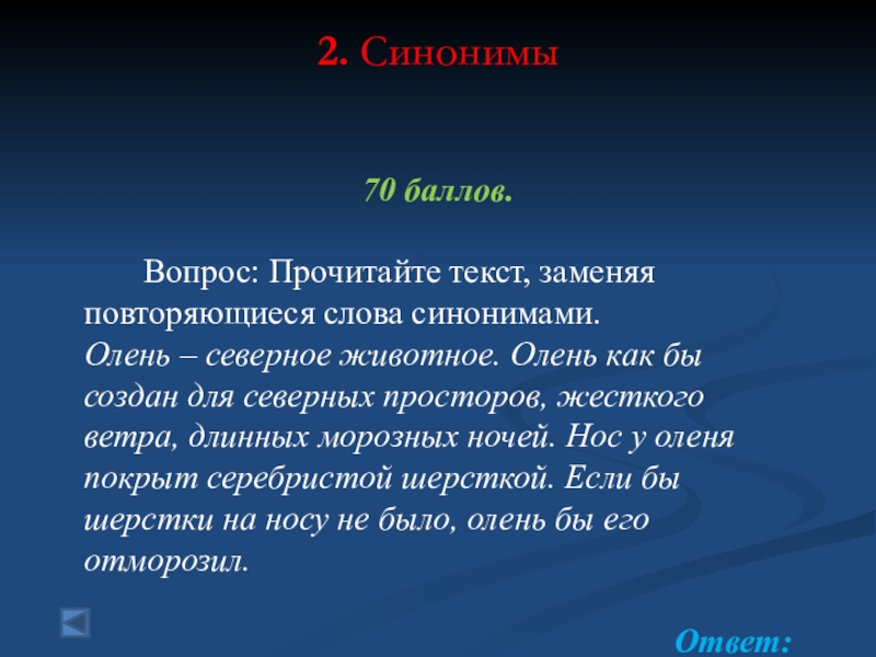 2. Синонимы 70 баллов.    Вопрос: Прочитайте текст, заменяя повторяющиеся слова синонимами. Олень – северное