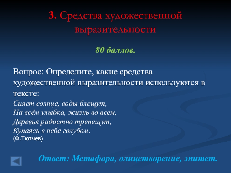 3. Средства художественной выразительности40 баллов.   Вопрос: Назовите средство художественной выразительности, представляющее собой перенос значения слова
