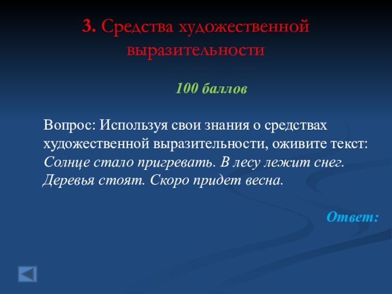 3. Средства художественной выразительности100 балловВопрос: Используя свои знания о средствах художественной выразительности, оживите текст: Солнце стало пригревать.