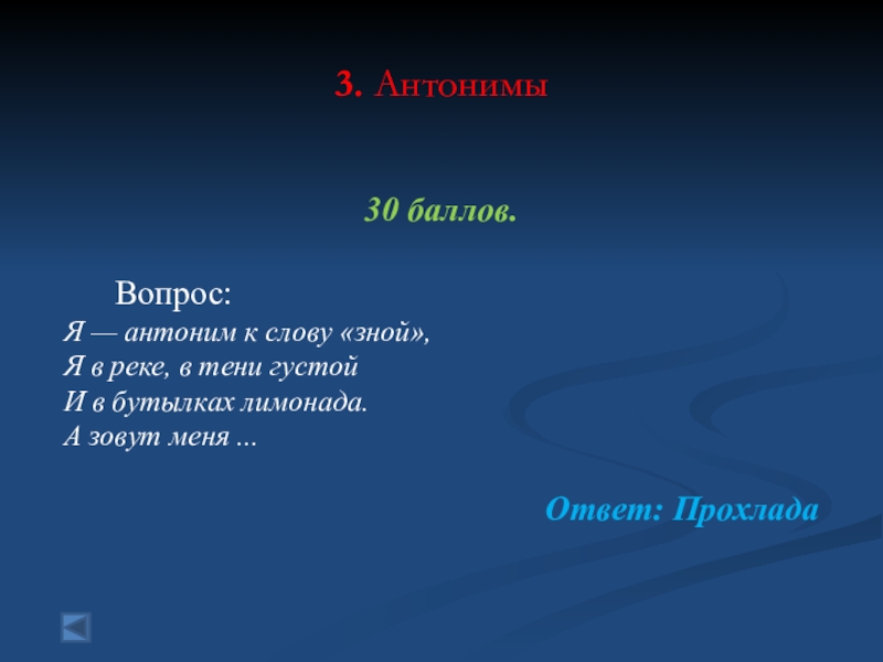 3. Антонимы30 баллов.    Вопрос: Я — антоним к слову «зной», Я в реке, в