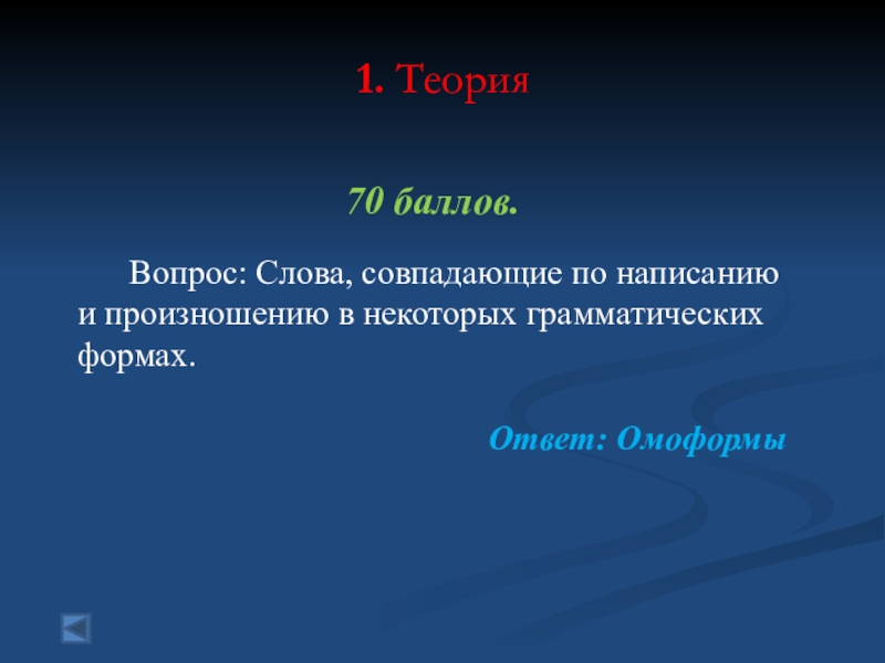 1. Теория 70 баллов.    Вопрос: Слова, совпадающие по написанию и произношению в некоторых