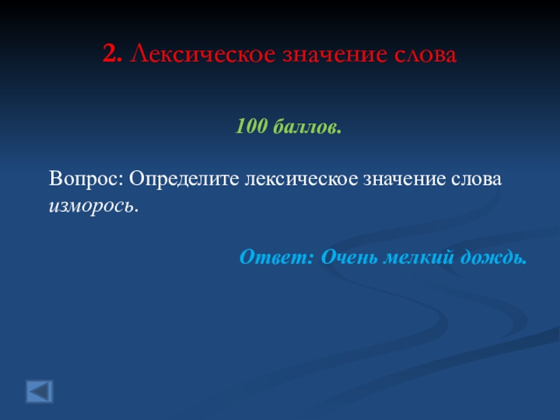 2. Лексическое значение слова 100 баллов. Вопрос: Определите лексическое значение слова изморось.Ответ: Очень мелкий дождь.