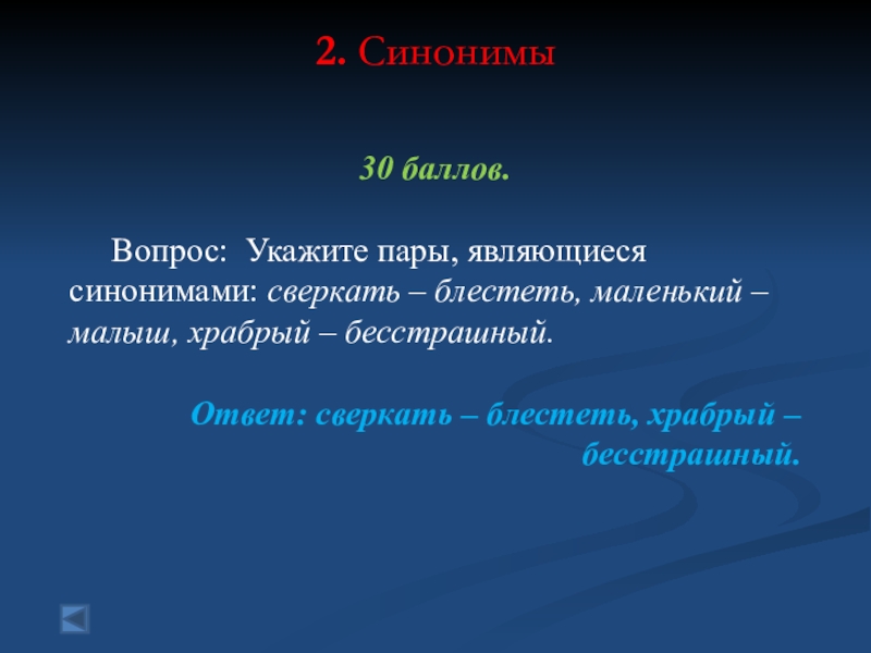 2. Синонимы  30 баллов.   Вопрос: Укажите пары, являющиеся синонимами: сверкать – блестеть, маленький –