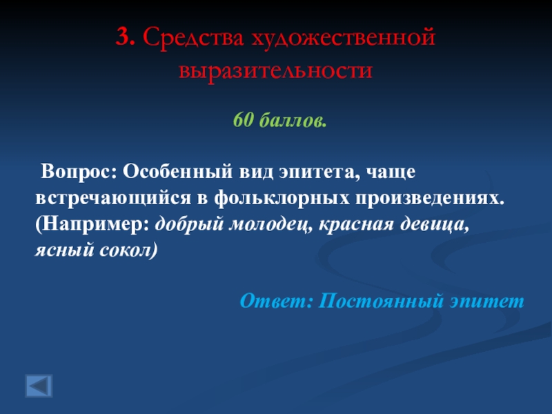 3. Средства художественной выразительности60 баллов. Вопрос: Особенный вид эпитета, чаще встречающийся в фольклорных произведениях. (Например: добрый молодец,