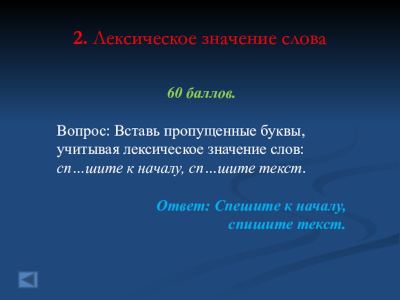 2. Лексическое значение слова60 баллов. Вопрос: Вставь пропущенные буквы, учитывая лексическое значение слов: сп…шите к началу, сп…шите