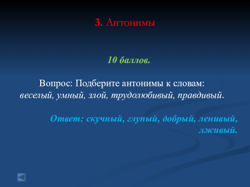3. Антонимы 10 баллов.     Вопрос: Подберите антонимы к словам: веселый, умный, злой,