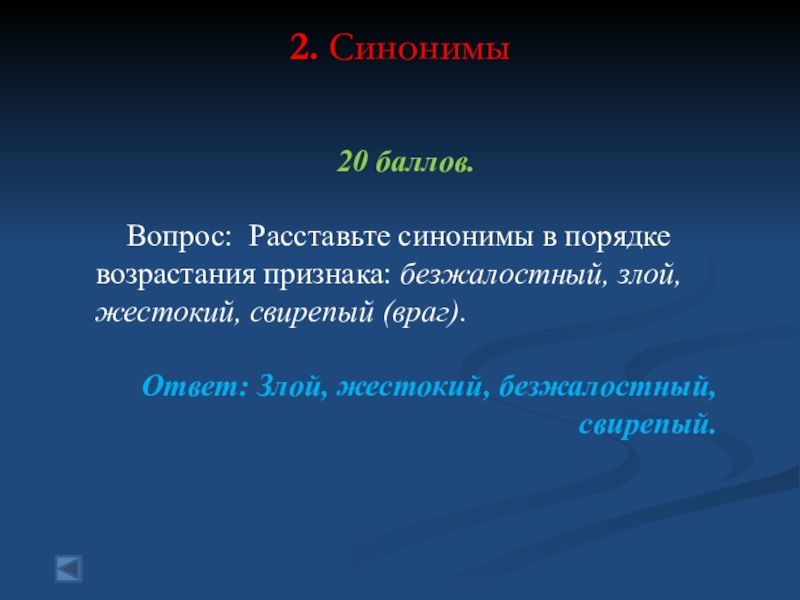 2. Синонимы 20 баллов.   Вопрос: Расставьте синонимы в порядке возрастания признака: безжалостный, злой, жестокий, свирепый