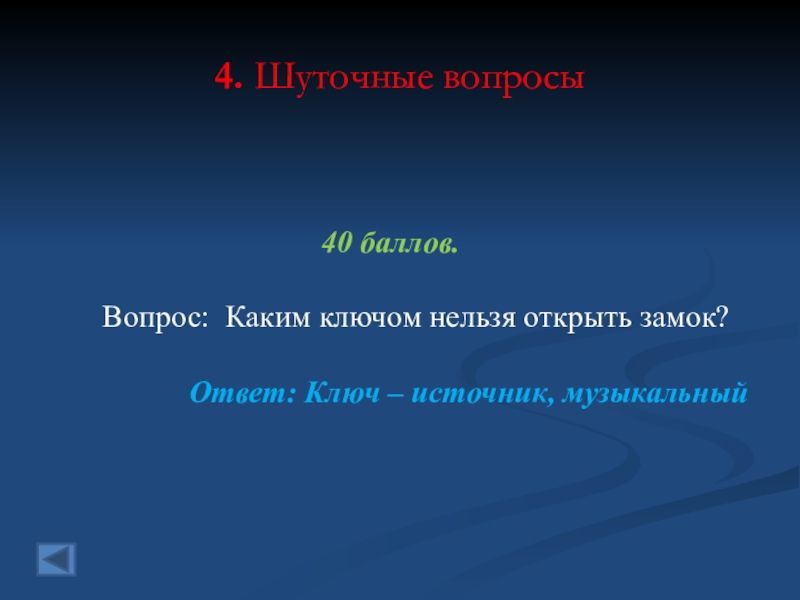 4. Шуточные вопросы40 баллов.     Вопрос: Каким ключом нельзя открыть замок?Ответ: Ключ – источник,