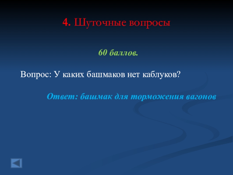 4. Шуточные вопросы60 баллов. Вопрос: У каких башмаков нет каблуков?Ответ: башмак для торможения вагонов
