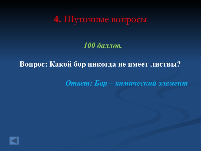 4. Шуточные вопросы100 баллов. Вопрос: Какой бор никогда не имеет листвы?Ответ: Бор – химический элемент